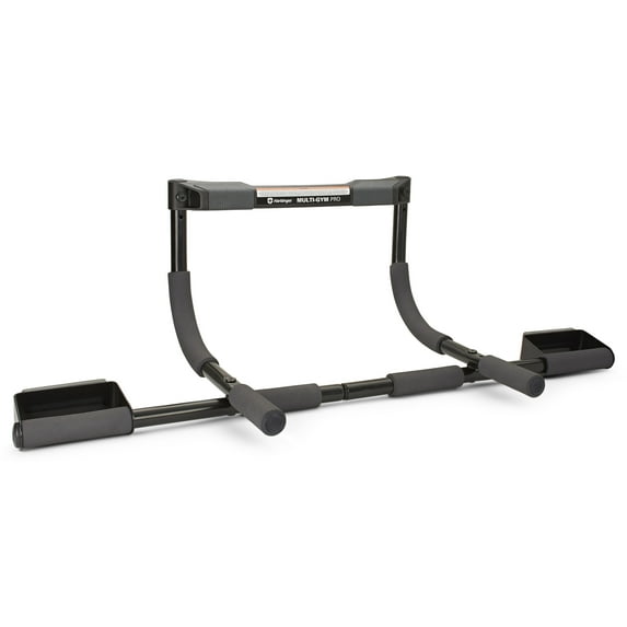 The Harbinger Multi-Gym Pro is a portable gym system that be used as doorway pullup bars as well as for sit-ups, pushups and dips. The Multi-Gym Pro targets arms, chest, core and back muscles with workouts that ensure maximum muscle engagement. It features padded handles that allow for 4 grip positions to perform normal grip, close grip, wide grip and hammer grip pullups. The 300lb. weight capacity makes it safe to use with a weight vest. Placed on the floor, the Multi-Gym Pro can be used for sit-ups, pushups, and dips; padded handles provide comfort and help to ensure correct form. It also has a patented door frame guard using a unique flat design with thick foam pads to help protect doorframes. Easy to install with no drilling required, the Multi-Gym Pro securely fits door frames 27 – 33" wide and up to 6 inches deep. Assembled dimensions: Pro 15" x 38" x 14"; weight 6.2 pounds