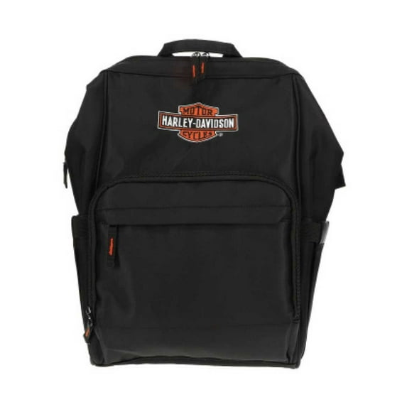 Harley-Davidson® Diaper Backpack - Black, 7150914. Features an embroidered Bar & Shield logo. Made from durable nylon canvas. Reinforced carry handle and padded adjustable back straps. Outer zippered pocket. Features: Insulated bottle pockets, inside mesh pocket and changing pad. Expandable elastic pocket. Rectangular frame for easy entry.