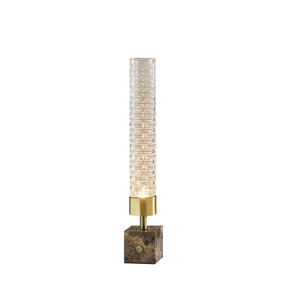 Catch the eye of all your guests with the Harriet LED Table Lantern. A cube shaped brown marble base holds up a tall, skinny textured glass cylinder shaped shade. The warm, energy efficient LED light reflecting off of the carefully cut glass creates a striking, artistic glow. Place this lamp on your console table, bookcase or nightstand for soft, ambient lighting and a pop of glamourous, mid-century style. A sleek touch switch on the base turns the lamp on and off.