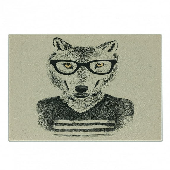 Hero image 0 of Hipster Cutting Board, Hand Drawn Design Portrait of Happy Wolf in Stripped T Shirt and Glasses, Decorative Tempered Glass Cutting and Serving Board, in 3 Sizes, by Ambesonne, 0 of 2