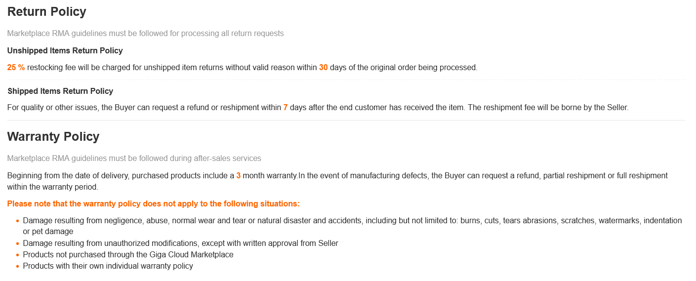 Beginning from the date of delivery, purchased products include a 3 month warranty.In the event of manufacturing defects, the Buyer can request a refund, partial reshipment or full reshipment within the warranty period. Please note that the warranty policy does not apply to the following situations: Damage resulting from negligence, abuse, normal wear and tear or natural disaster and accidents, including but not limited to: burns, cuts, tears abrasions, scratches, watermarks, indentation or pet damage Damage resulting from unauthorized modifications, except with written approval from Seller Products not purchased through the Giga Cloud Marketplace Products with their own individual warranty policy