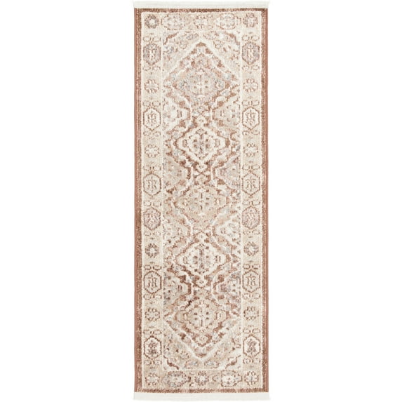 Elevate your space with our Home Decor Collection 20"x60" Rust Persian Indoor Runner Rug. Crafted with a luxurious 100% polyester pile, this machine-woven masterpiece boasts rich rust, beige, ivory, and brown hues, creating a captivating palette that effortlessly compliments any decor scheme. Its intricate design is enhanced by delicate fringe on each end, adding a touch of sophistication to your home. .