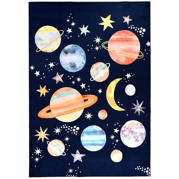 To infinity and beyond, the galaxy has been captured on Sara B.'s Homefires by Jellybean poly-suede floor cloth. The vibrant hues against a dark blue background are printed on machine washable polyester. The suede like floor cloth is available in four sizes.