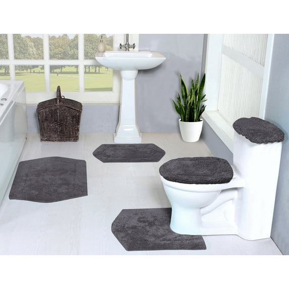 Home Weavers Waterford Collection 100% Cotton Non-Slip Bathroom Rug Set Machine Washable Bathroom Rug, Bath Rug, U Shaped Contour, Lid Cover, Toilet Tank Cover, Gray Color 5 Piece Bath Carpet set