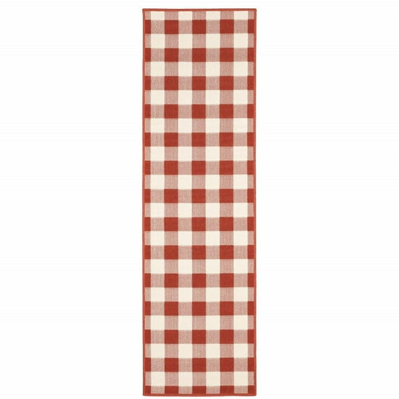 HomeRoots 2' X 8' Red and Ivory Geometric Stain Resistant Indoor Outdoor Area Rug