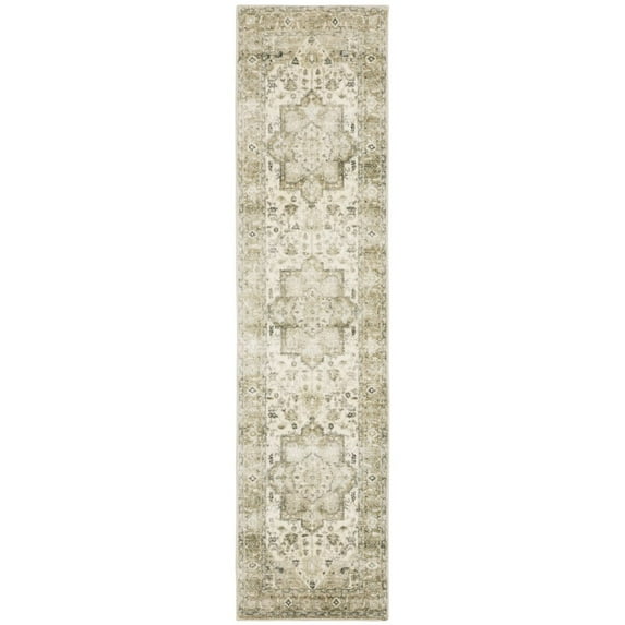 This 2' x 8' tan ivory grey and beige oriental power loom stain resistant runner rug, is a great way to add warmth to a room. This runner shaped rug features a oriental design in tan ivory grey and beige to give it visual interest. A classic shape marries with good looking design for your space Ideal for spaces with kids and pets, this rug is stain resistant to help repel stains and spilled liquids. Place this area rug against a hardwood or tile floor and it will enliven your living space with style and sophistication. 0.39" H x 24.02" W x 95.67" D