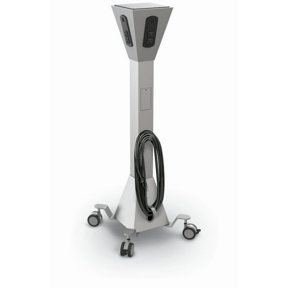 - MOBILE AND VERSATILE: / Easily mobile on four dual-wheel casters including two locking casters this power tower is designed for versatility. The durable powder-coated steel frame includes a cord winder for the 13.5' power cable.