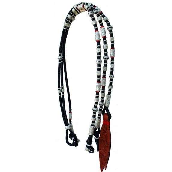 - ✔ CONSTRUCTION: Romal reins are a classic element of Vaquero horsemanship, recognized for their intricate braided design and their application in many Western riding disciplines. These reins feature a closed-loop design with a distinctive braided extension called the romal, typically made from rawhide or leather, often ending with a quirt or popper. The added weight and decorative buttons on the romal enhance the rider’s communication with the horse by delivering clear, subtle cues. Detailed Overview: Braided Craftsmanship: Romal reins are usually hand-braided from rawhide or leather, providing durability, strength, and flexibility for long-term use. Romal Extension: This is the continuation of the closed rein, extending into a longer, weighted braided section designed for handling or cueing, and it often rests over the horse's neck. Weight and Button Placement: The strategic placement of weight and buttons on the romal helps create a distinct feel for the rider and allows for more precise, refined signals to the horse. Attached Quirt or Popper: Many romal reins are finished with a small quirt or popper at the end, which can be used to reinforce cues or assist in specific movements when needed. Traditional and Competitive Use: A hallmark of traditional Vaquero riding, romal reins are commonly seen in events like working cow horse, reining, ranch riding, and other Western performance disciplines. Balance of Precision and Fluidity: These reins offer riders excellent control while allowing for smooth, responsive communication, making them ideal for skilled horsemanship and advanced riding techniques.✔ FEATURES: Full grain American Harness Leather with Rawhide Braiding. Reins are 53" (4' 5") long with latigo tie bit ends. Romel is 47" (3' 11") long and features a 12" x 1 3/8" contoured popper. Reins are 1/2" wide for a comfortable feel and grip.Challenger romel reins are constructed of durable cherry leather. Rounded edges and rawhide help provide excellent grip on the reins for all activities. Features brown rawhide accents. Reins are 53" (4' 5") long with latigo tie bit ends. Romel is 47" (3' 11") long and features a 12" x 1 3/8" contoured floral tooled popper. Reins are 1/2" wide for a comfortable feel and grip.Horse Western Tack Black Leather Rawhide Romel Romal Reins Tooled Popper 66BT03