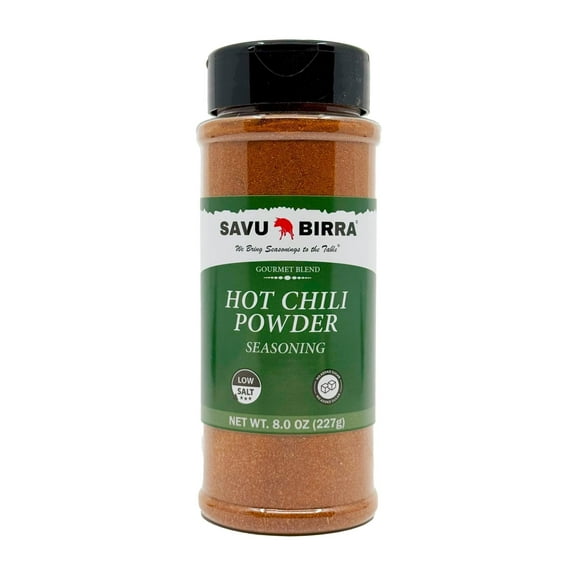 Savu Birra Hot Chili Powder is a vibrant seasoning blend crafted from an exquisite selection of premium chili peppers, including Ancho, Guajillo, Habanero, and Red Chile, alongside sea salt, cumin, oregano, and granulated garlic. This versatile blend delivers an exhilarating heat with a perfect balance of smokiness and spice, offering a deep flavor profile that is both sweet and fruity. It is ideal for adding a fiery kick to chili, soups, stews, marinades, rubs, roasted vegetables, salsas, tacos, and grilled meats, enhancing the taste of your homemade dishes. Made with fresh, premium ingredients, this seasoning contains no MSG or artificial colorants, and is designed to use less salt while maximizing flavorful spices. Available in 1.75, 4.6, and 8.0 ounce bottles, it's an essential addition for those who enjoy a little heat in their meals.