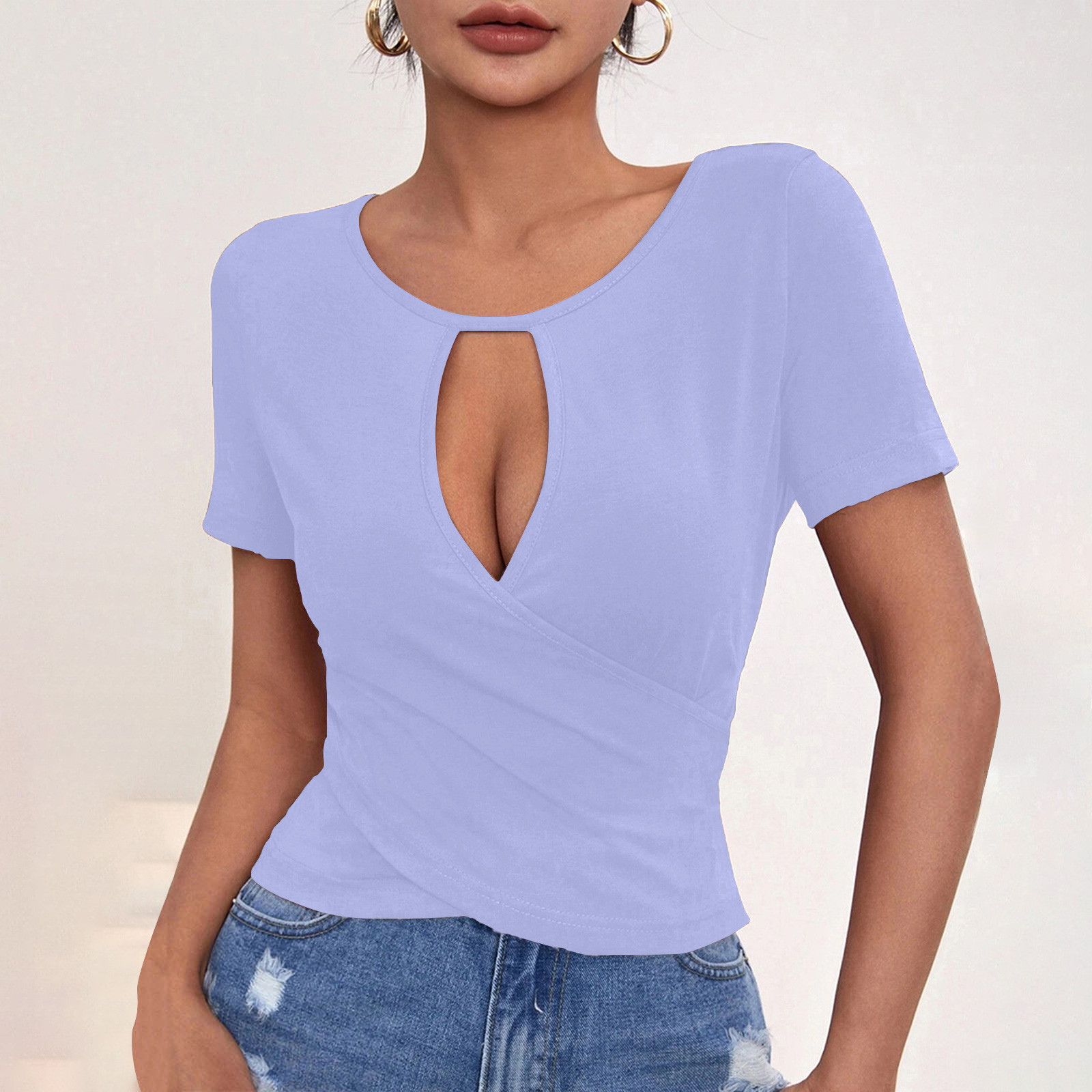 Hero image 0 of Hot days, bold styles Olyvenn Women Short Sleeve Deep V Neck Tops Casual Sexy Cut Out Twist Knot Blouse Comfy Solid Shirts Fitted Cotton Tshirt Tee Purple S, 0 of 8