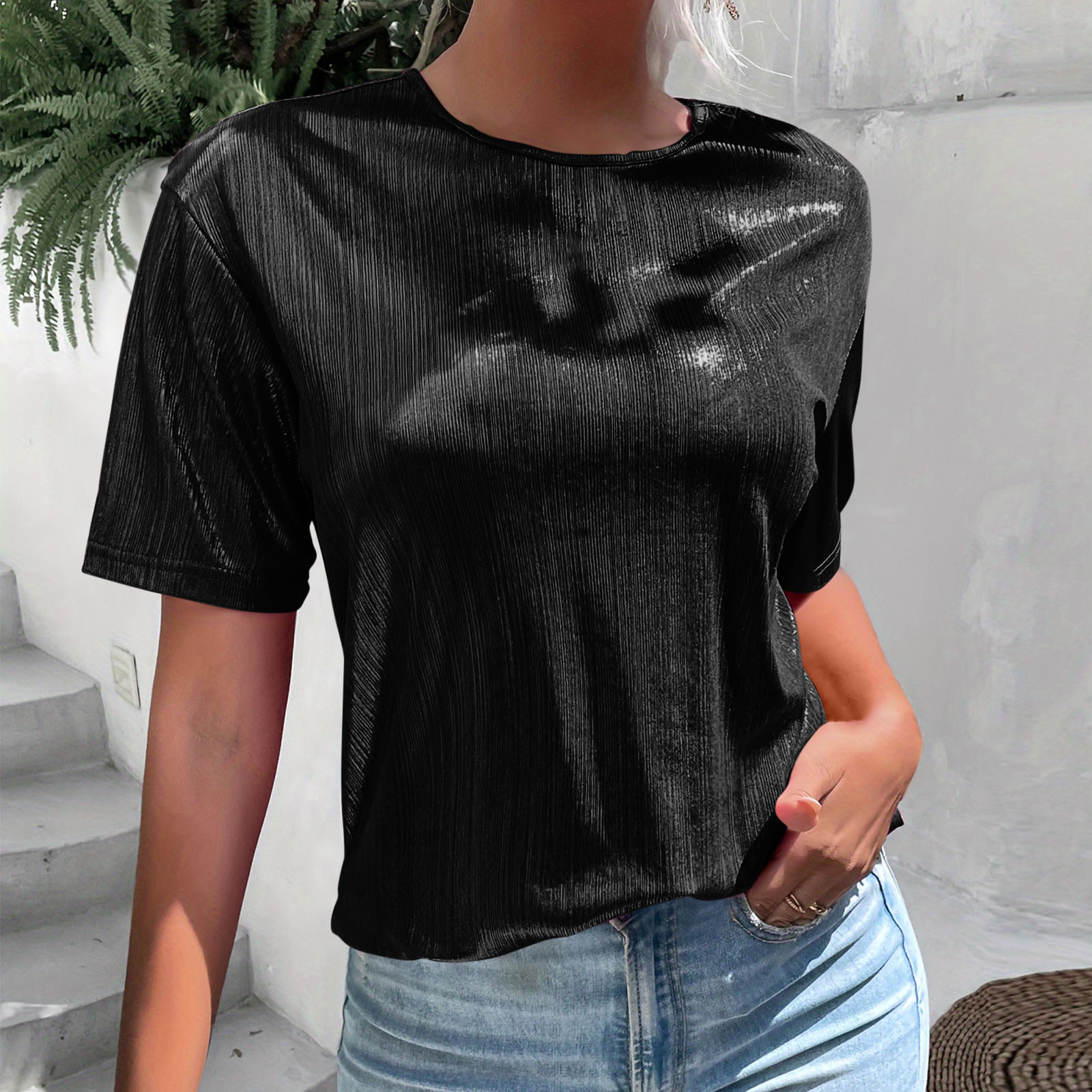 Hero image 0 of Hot days, bold styles. Olyvenn Women's Metallic Shiny Top Round Neck Short Sleeve Party Disco Tee Shirt Top Crew Neck Summer Fashion Shirts Black S, 0 of 9