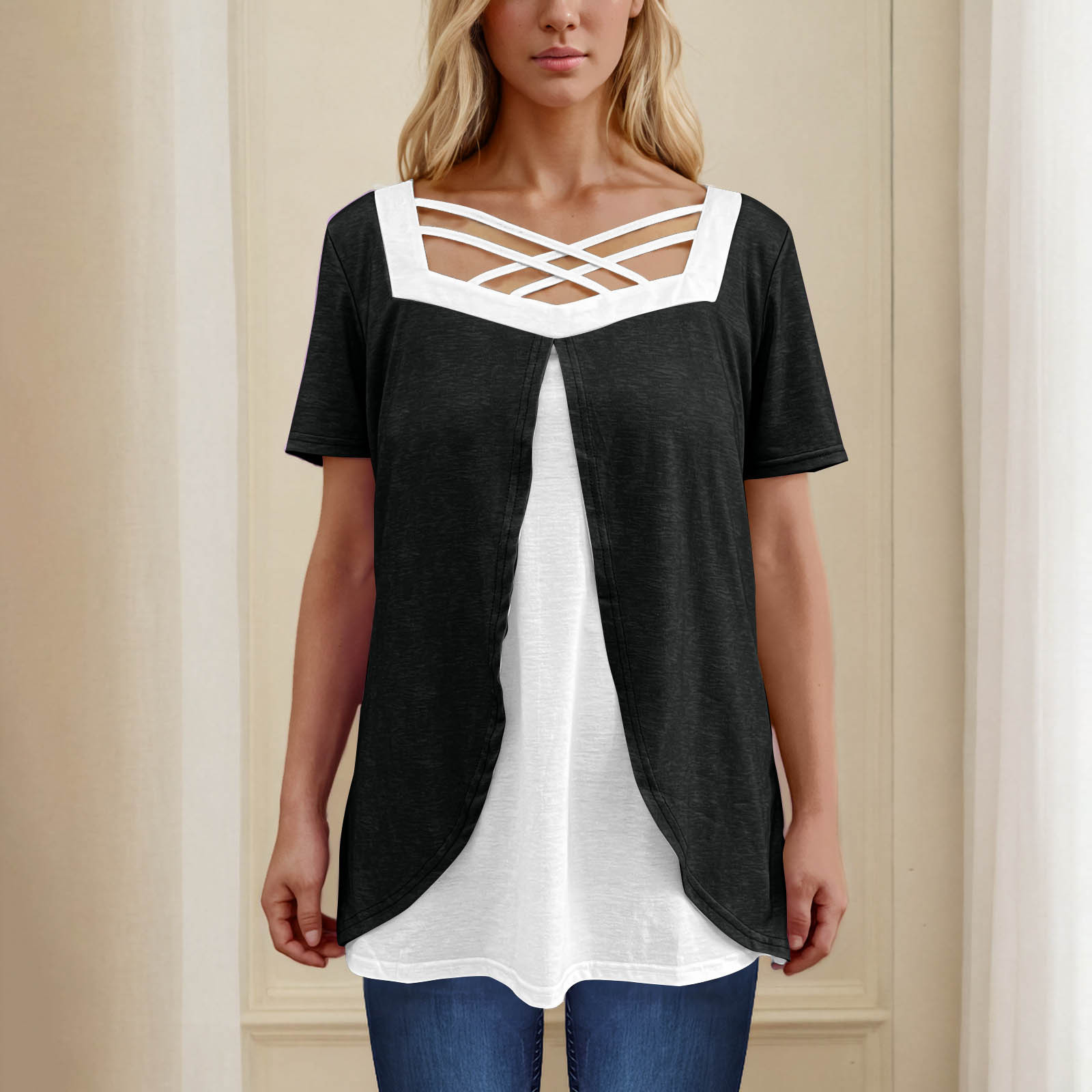 Hero image 0 of Hot days, bold styles Olyvenn Womens Plus Size Tops Summer Dressy Hollow Out Boat Neck Short Sleeves Lightweight T-Shirt Color Blocked Patchwork Tee Black XXXL, 0 of 6