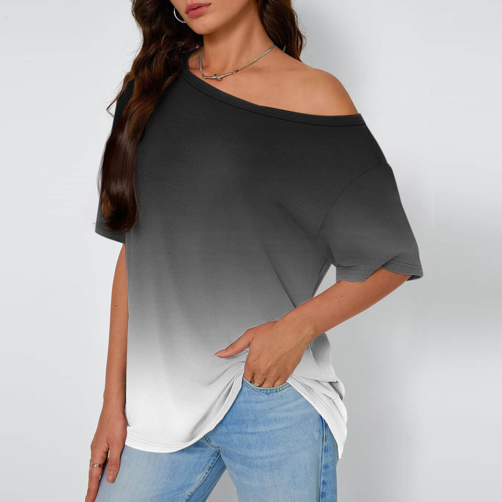 Hot days, bold styles Olyvenn Womens Summer Tops Gradient Printed Short Sleeve Top Cold Shoulder Tunic T Shirt Casual Versatile Blouses Lounge Stylish Tops Black XL