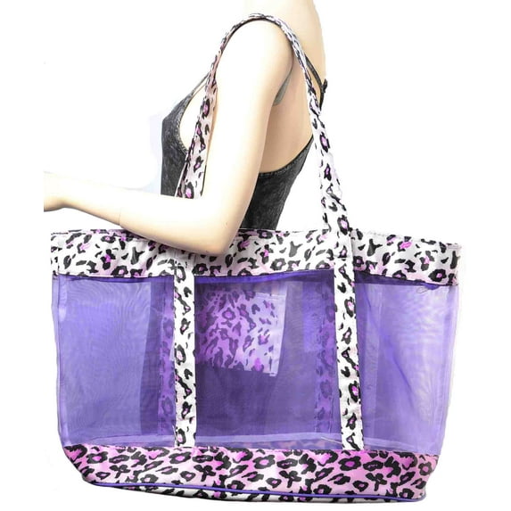 Measures: 24"x15"x8.5Material: Mesh and nylonInside pocket!Product descriptionHUGE! This tote bag is so fun and funky! Leopard print with mesh inlets is perfect for everyday, the beach, groceries or carry-on. It even has an inside pocket for your necessities. Measures: 24"x15"x8.5
