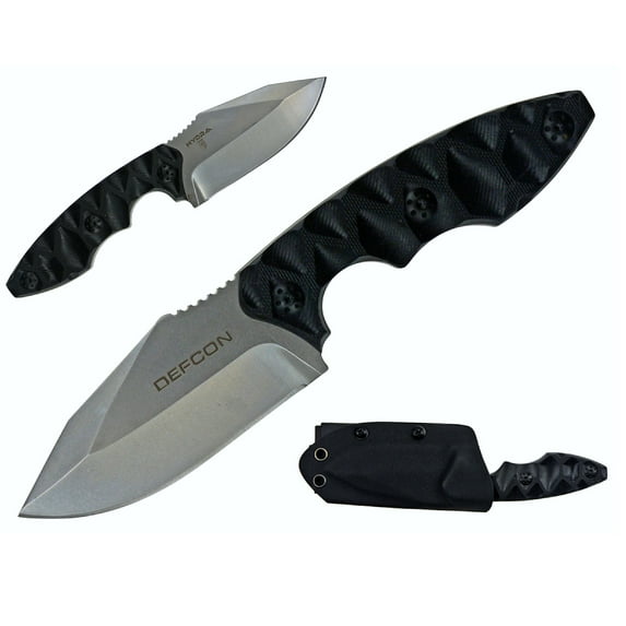 Hydra Fixed Blade. 7.5" overall. 3.5" satin finish D2 tool steel drop point blade. Black sculpted G10 handle. Full tang. Black Kydex belt sheath. Boxed.