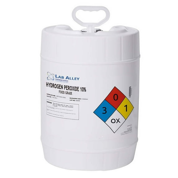 Hydrogen Peroxide 10% is composed of 10% hydrogen peroxide (H2O2) and 90% water (H2O). Food grade hydrogen peroxide 10% is a clear, colorless liquid that is free of any stabilizers or additives. Food grade hydrogen peroxide is great to use for food application. Certified by the Food Chemical Codex (FCC), the hydrogen peroxide is validated for its quality and purity. Through this certification, customers are assured that Lab Alley’s FCC Certified Food Grade Hydrogen Peroxide 10% maintains integrity. Lab Alley sources hydrogen peroxide through reputable manufacturers allowing the highest quality of hydrogen peroxide 10% solution to be provided to our customers. We have a consistent, quality product and are the reliable choice for your food grade hydrogen peroxide 10% solution needs. With quick processing, Lab Alley is where to buy food grade hydrogen peroxide 10%. Food grade hydrogen peroxide 10% is in stock in multiple sizes ranging from 500mL bottles to 55 gallon drums. Lab Alley also provides pallets of chemicals.