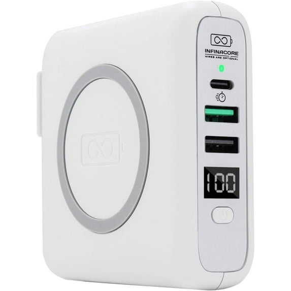 INFINACORE Pandora Portable Power (P3) 8000mAh Fast Charging Qi Wireless Power Bank Charger - Compatible with iPhone 15 14 13 12 11 Pro Max Mini - Phone Laptop iPad Tablet Power Bank - White