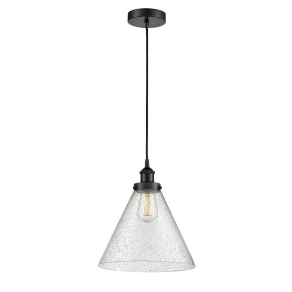 Collection: Cone, Material: Steel, Finish Color: Matte Black, Width: 12", Height: 14.75", Length: 12", Lamping Type: Incandescent, Number Of Bulbs: 1, Wattage: 60 Watts, Cri: 99, Color Temperature: 2200 Kelvin, Lumens: 220, Dimmable: Yes, Moisture Rating: Damp Rated, Desc: Innovation at its finest and a true game changer. Edison marries the best of our Franklin and Ballston collections to give you versatility of design and uncompromising construction.� Edison fixtures are industrial-inspired that can be customized with glass or metal shades from both the Franklin and Ballston collections. Includes 10 feet of fabric cord / Sloped ceiling compatible / 4.75 inch steel canopy / Rated for 100 watt maximum / UL/CUL Damp Rated / Compatible with Incandescent, LED, Fluorescent and Halogen bulbs. ,-Cone - 1 Light Mini Pendant In Industrial Style-14.75 Inches Tall and 12 Inches Wide-Matte Black Finish-Seedy Glass Color-Restoration,Vintage,Urban,Farmhouse,Transitional,Traditional,Early Electric,Industrial,Mid-century,Pendant Lighting,Mini Pendants,LED Compatible,Dimmable,Clear Glass,Cone Shaped Glass,Adjustable Cords,Damp locations,Vaulted Ceiling Compatible,Sloped Ceiling Compatible-616-1PH-BK-G44-L