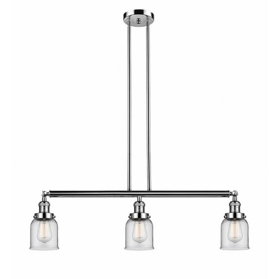Innovations Lighting-213-PN-G52-Collection: Bell, Material: Brass, Finish Color: Polished Nickel, Width: 37.5", Height: 10", Length: 5", Lamping Type: Incandescent, Number Of Bulbs: 3, Wattage: 100 Watts, Cri: 99, Color Temperature: 2200 Kelvin, Lumens: 220, Dimmable: Yes, Moisture Rating: Damp Rated, Desc: One of our largest and original collections, the Franklin Restoration is made up of a vast selection of heavy metal finishes and a large array of metal and glass shades that bring a touch of industrial into your home. Includes 10 feet of wire / Includes two 6 inch and four 12 inch stems. Additional 3, 6 & 12 inch stems sold separately as part numbers ST-3M-AC, ST-6M-AC and ST-12M-AC / Solid brass 180 degree adjustable swivels with internal teeth that lock in at 5 degree intervals with engraved cast cup / Solid brass 90 degree hang straight swivel for sloped ceilings included / Rated for 100 watt maximum per socket / UL/CUL Damp Rated / Compatible with Incandescent, LED, Fluorescent and Halogen bulbs. ,-Bell - 3 Light Island In Industrial Style-10 Inches Tall and 37.5 Inches Wide-Polished Nickel Finish-Clear Glass Color