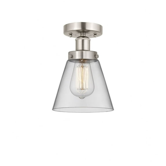 Collection: Cone, Material: Steel, Finish Color: Brushed Satin Nickel, Width: 6.5", Height: 8.25", Length: 6.5", Lamping Type: Incandescent, Number Of Bulbs: 1, Wattage: 60 Watts, Cri: 99, Color Temperature: 2200 Kelvin, Lumens: 220, Dimmable: Yes, Moisture Rating: Damp Rated, Desc: Innovation at its finest and a true game changer. Edison marries the best of our Franklin and Ballston collections to give you versatility of design and uncompromising construction.� Edison fixtures are industrial-inspired that can be customized with glass or metal shades from both the Franklin and Ballston collections. 4.5 inch 2mm heavy cast canopy / Rated for 100 watt maximum / UL/CUL Damp Rated / Compatible with Incandescent, LED, Fluorescent and Halogen bulbs. , - - Cone - 1 Light Semi-Flush Mount In Industrial Style-8.25 Inches Tall and 6.5 Inches Wide-Brushed Satin Nickel Finish-Clear Glass Color -