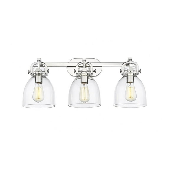 Innovations Lighting-410-3W-PN-G412-7CL-Collection: Newton Bell, Material: Glass, Finish Color: Polished Nickel, Width: 27", Height: 11.88", Length: 8.88", Height From Outlet Box: 1.75", Backplate Width: 8.25", Backplate Length: 4.38", Lamping Type: Incandescent, Number Of Bulbs: 3, Wattage: 100 Watts, Dimmable: Yes, Moisture Rating: Damp Rated, Desc: The Newton Bell is a modern industrial collection that incorporates exceptional architectural details and classic bell shaped shade. The delicately curved glass or metal shade complements the clean lines of this restoration inspired line of fixtures. The glass shades are easily removed with the four oversized thumb screws for cleaning / UL/CUL Damp Rated / Rated for 100 watt maximum per socket / Compatible with Incandescent, LED, Fluorescent and Halogen bulbs / Wall-mounted with 2mm heavy cast backplate / Backplate/Canopy Shape: Oval. ,-Newton Bell - 3 Light Bath Vanity In Industrial Style-11.88 Inches Tall and 27 Inches Wide-Polished Nickel Finish-Clear Glass Color