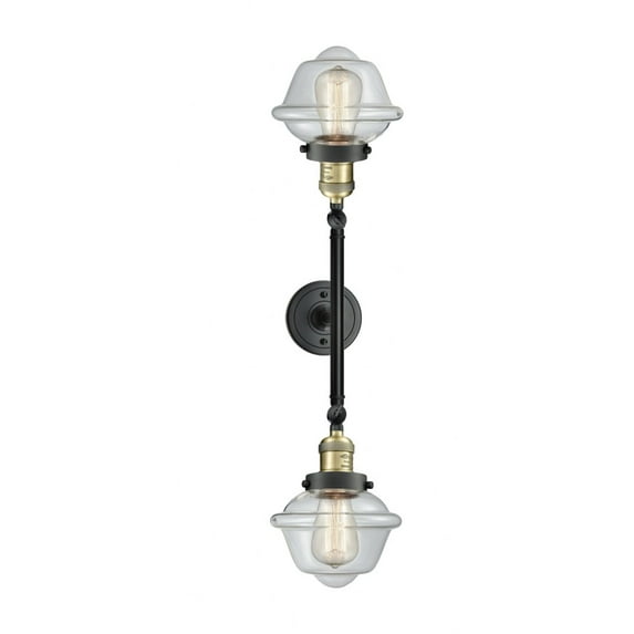 Innovations Lighting-208L-BAB-G532-Collection: Oxford, Material: Steel, Finish Color: Black Antique Brass, Width: 7.5", Height: 30.38", Length: 9", Height From Outlet Box: 2.25", Backplate Width: 4.5", Backplate Length: 4.5", Lamping Type: Incandescent, Number Of Bulbs: 2, Wattage: 100 Watts, Cri: 99, Color Temperature: 2200 Kelvin, Lumens: 220, Dimmable: Yes, Moisture Rating: Damp Rated, Desc: One of our largest and original collections, the Franklin Restoration is made up of a vast selection of heavy metal finishes and a large array of metal and glass shades that bring a touch of industrial into your home. Solid brass 180 degree adjustable swivels with internal teeth that lock in at 5 degree intervals / Fixtures can be hung horizontally or vertically / Fixture can be hung with bulbs facing up or down as a wall mount / 4.5 inch 2mm heavy cast backplate / Distance from outlet opening to top of fixture 2.25 inches / Rated for 100 watt maximum per socket / UL/CUL Damp Rated / Compatible with Incandescent, LED, Fluorescent and Halogen bulbs. ,-Oxford - 2 Light Bath Vanity In Traditional Style-30.38 Inches Tall and 7.5 Inches Wide-Black Antique Brass Finish-Clear Glass Color