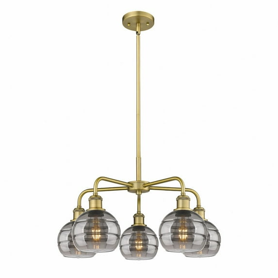 Innovations Lighting-516-5CR-BB-G556-6SM-Collection: Rochester, Material: Steel, Finish Color: Brushed Brass, Width: 23.88", Height: 13.38", Length: 23.88", Lamping Type: Incandescent, Number Of Bulbs: 5, Wattage: 100 Watts, Dimmable: Yes, Moisture Rating: Damp Rated, Desc: A truly dynamic fixture, the Ballston fits seamlessly amidst most d�cor styles. Its sleek design and vast offering of finishes and shade options makes the Ballston an easy choice for all homes. Our process of handblowing the glass shade makes each product unique and creates an artisanal look / Shades showcase exquisite glass band detailing. These bands are the result of a complex and delicate glassblowing technique, making each shade truly one-of-a-kind. While the exterior of the glass shade has a sleek and smooth finish, the interior surface features thickened bands that enhance its visual appeal / UL/CUL Damp Rated / Rated for 100 watt maximum per socket / Compatible with Incandescent, LED, Fluorescent and Halogen bulbs / Includes one 6" and two 12" stems for 30" total hanging length / Sloped ceiling compatible / Flush-mounted with a 2mm cast canopy / Included stems match the finish of the frame. ,-Rochester - 5 Light Stem Hung Chandelier In Industrial Style-13.38 Inches Tall and 23.88 Inches Wide-Brushed Brass Finish-Light Smoke Glass Color
