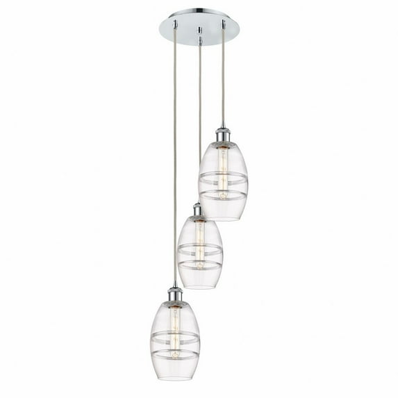 Innovations Lighting-113B-3P-PC-G557-6CL-Collection: Vaz, Material: Steel, Finish Color: Polished Chrome, Width: 12.38", Height: 25.13", Length: 12.38", Chain Length: 120", Lamping Type: Incandescent, Number Of Bulbs: 3, Wattage: 100 Watts, Dimmable: Yes, Moisture Rating: Damp Rated, Desc: A truly dynamic fixture, the Ballston fits seamlessly amidst most d�cor styles. Its sleek design and vast offering of finishes and shade options makes the Ballston an easy choice for all homes. Our process of handblowing the glass shade makes each product unique and creates an artisanal look / Shades showcase exquisite glass band detailing. These bands are the result of a complex and delicate glassblowing technique, making each shade truly one-of-a-kind. While the exterior of the glass shade has a sleek and smooth finish, the interior surface features thickened bands that enhance its visual appeal / UL/CUL Damp Rated / Rated for 100 watt maximum per socket / Compatible with Incandescent, LED, Fluorescent and Halogen bulbs / Includes 120" of textured cord that can be cut to your desired hanging length / Sloped ceiling compatible / Flush-mounted with a 2mm cast canopy. ,-Vaz - 3 Light Cord Hung Multi Pendant In Industrial Style-25.13 Inches Tall and 12.38 Inches Wide-Polished Chrome Finish-Clear Glass Color