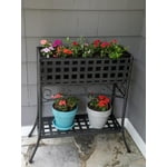 I had bought a plant stand, but some of the pots weren't stable on it. So I bought the Black lattice medal stand to hold pots that I don't want to break. I love it! The lattice allows you to see the patterns on the pots. I put some brightly colored ones with miniature succulents. There's also a shelf below for other pots or supplies. It was pretty easy to assemble and they sent enough hardware. It is a nice height and will probably hold up well in the rain.