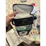 This convenient cooler is a must have for new mommas! It's the perfect size for toting both bottles and food on the go. The handy shoulder strap makes it hands free, which is a necessity! I especially love the ability to pack enough bottles and food to last throughout the day- and they stay cool for hours on end. It does include an ice pack. The two compartments are a great size. The bottom easily fits up to 6 bottles and the top zippered area is a separate space for food or chilled medicine. The material easily wipes clean- and that is one of my top criteria. I attached a picture of the print up close. From a distance it's more subtle and I just love the ears pattern. Not too over the top. This is a great and flexible cooler for new parents and I highly recommend!!!