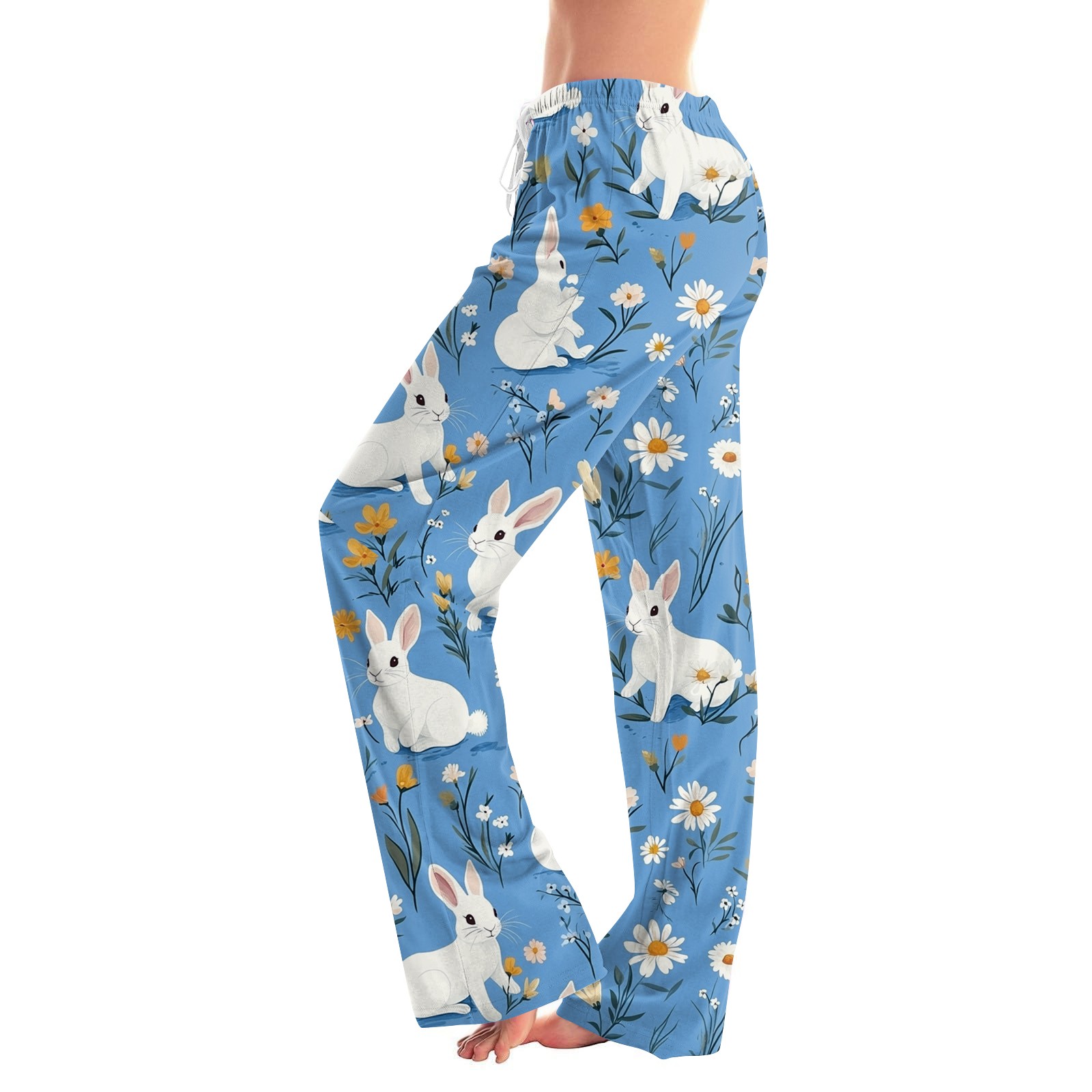 JGNGSHN Women's Cozy Easter Bunny Pajama Pants, Soft Lounge Pants with Wide Leg & Drawstring Waist Blue XL