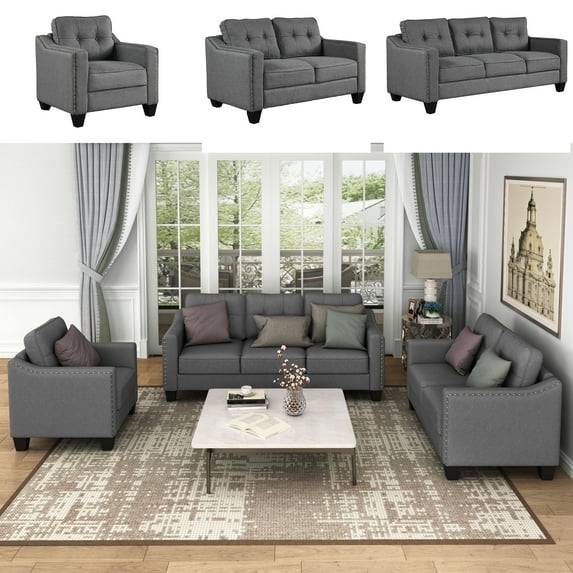 Save withShipping, arrives in 2 daysClearance CECER 3 Pieces Living Room Sofa Set with Nailhead Trim,Linen Fabric Sectional Sofa and Couch Set for Living Room,Including 3-Seater Sofa,Loveseat and Armchair,Dark Grey $519.99 Was $589.99