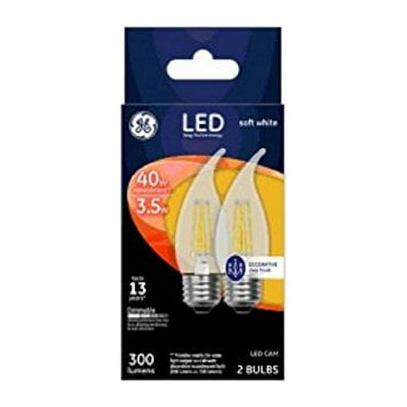 Bent tip decorative for chandeliers and sconces. GE LEDs offer outstanding energy efficiency, long-lasting performance and just-right brightness, all in one package. They're dimmable and illuminate your home with soft, warm light. Use these indoor chandeliers, sconces and fixtures where the bulb is visible. Thanks to its aesthetic design, this GE LED compliments your fixture and adds a decorative touch even when the light is off. When it's turned on, GE LED's long life and low energy use will help you save money on energy. This device complies with part 15 of the FCC rules. Operation is subject to the following two conditions: 1. This device may not cause harmful interference, and 2. This device must accept any interference received, including interference that may cause undesired operation. Any changes or modifications not expressly approved by the manufacturer could void the user's authority to operate the equipment. Limited warranty: Guaranteed to last 5 years based on rated life at 3-hour use per day at 120V. If this bulb does not last for 5 years based on 3-hour per day/7 days per week return bulb, proof of purchase and your name and address. GE will replace your bulb. Bulb replacement is GE's sole warranty obligation, and incidental and consequential damages are excluded. Some states do not allow the exclusion or limitation of incidental or consequential damages, so the above exclusion may not apply to you. This warranty gives you specific legal rights and you may also have other rights which vary from location to location. Made in China. 1 Based on 3-hour consumer use per day. 2 Electricity cost savings based on using the bulb for 15,000-hour rated life at 11c/kWh compared to twelve 65w incandescent bulbs rated life 1500-hour. Provides more light output 300 lumens vs. 280 lumens.