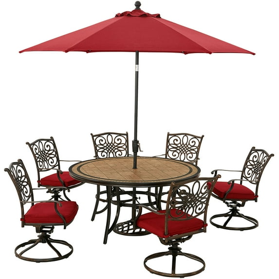 Hanover Monaco 7-Piece Outdoor Patio Dining Set, 6 Cushioned Swivel Rocker Chairs, 60" Round Tile Table, 9' Umbrella, and Umbrella Base, Brushed Bronze Finish, Rust-Resistant, All-WeatherHanover Monaco 7 Piece Outdoor Patio Dining Set 6 Cushioned Swivel Rocker Chairs 60 Round Tile Table 9 Umbrella Umbrella Base Brushed Bronze Finish RHanover Monaco 7 Piece Outdoor Patio Dining Set 6 Cushioned Swivel Rocker Chairs 60 Round Tile Table 9 Umbrella Umbrella Base Brushed Bronze Finish RHanover Monaco 7 Piece Outdoor Patio Dining Set 6 Cushioned Swivel Rocker Chairs 60 Round Tile Table 9 Umbrella Umbrella Base Brushed Bronze Finish R