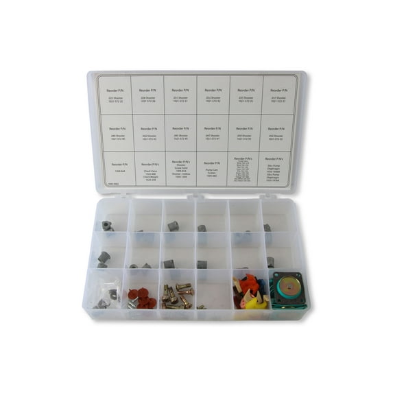 - Extensive Contents: Contains multiple sizes and quantities of pump discharge nozzles, needle valves, check valves, diaphragms, screws, gaskets, and cams.