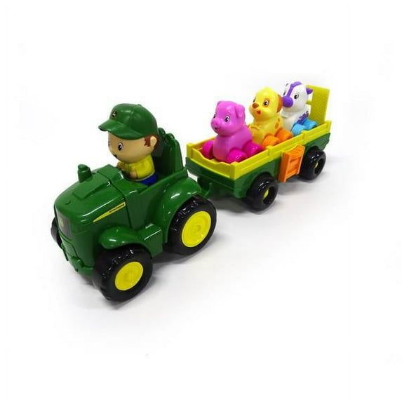 Grow With Me Toy: 6-piece developmental toy set with 3 toy animals plus a farmer, tractor, and wagon for ages 12m+;Push Along Play: Each animal features free rolling wheels for on-the-go farm fun;Matching Game: Match the animals correctly by either picture or shape to hear their unique sounds;Sing Along Toy: Push the side of the wagon for a merry farm sing along!;Officially Licensed John Deere Product: Produced by TOMY -- Our mission is to make the world smile!