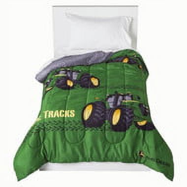 John Deere 'Tracks' Twin Comforter Your children can now incorporate tractors into their bedroom decor with the John Deere Twin Bedding Comforter. This playful tractor design features bold, bright colors kids are sure to love. Not only does this cuddly item feature an adorable design, but the super-soft microfiber will keep kids comfortable and warm throughout the night. The full-size comforter is a welcome addition to any bedroom. Made from 100 percent polyester, it is extremely durable to offer long-lasting performance. It is machine washable. The John Deere comforter is a good choice for kids of all ages. It easily transforms bedrooms into a fun and unique place. The item makes a wonderful gift. Product Details: 100% Polyester; Includes (1) Twin Comforter; Measurements: 64" x 86"; Machine Washable; Sheet Set NOT INCLUDED (Comforter ONLY); Licensed John Deere product ;