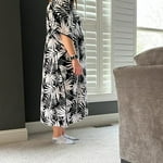 This women’s size large nightgown fits true to size. It is loose and very flowy. It has short sleeves and a midi length. The nightgown also has pockets. You pull the nightgown over your head. The fabric is thin and lightweight. It is a solid back with white palm leaves all over it. It is supposed to be a nightgown but I feel like it would be cute as a swimm coverup as well.