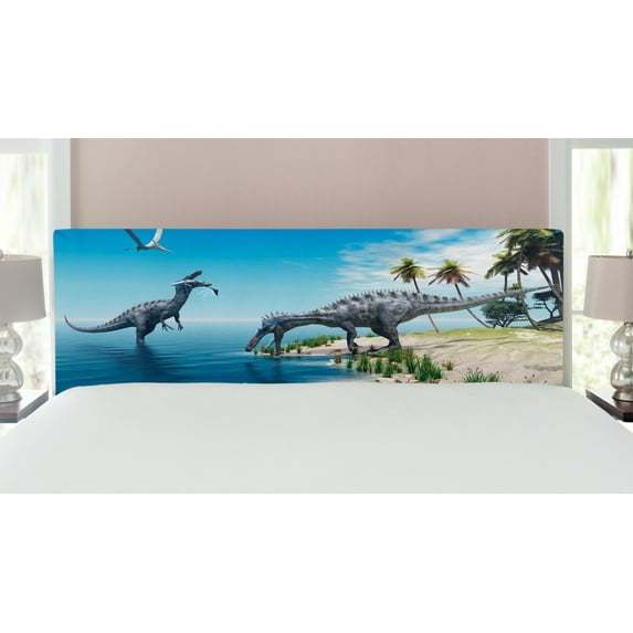 Jurassic Headboard, Large Fish is Caught by a Suchomimus Dinosaur Flying Pterosaur Dinosaur, Upholstered Decorative Metal Bed Headboard with Memory Foam, King Size, Blue Green Grey, by AmbesonneJurassic Headboard Large Fish Caught Suchomimus Dinosaur Flying Pterosaur Dinosaur Upholstered Decorative Metal Bed Headboard Memory Foam King Size B
