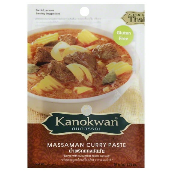 Gluten Free, Massaman Curry Paste, Bag 1.76 OZ For 3-5 persons. Authentic Thai. Gluten free. Serve with cucumber relish and roti. Rich and Spicy: The taste you can experience from the secret recipe by Mr. Kanok and Mrs. Wan, the known Thai food specialties for over 30 years. Their cooking recipe is legendary, as all the ingredients are generously and carefully selected in each manufacturing step, making the food you cook have a savory taste. www.kanokwan.co.th. Product of Thailand. Follow Mr. Kanok and Mrs. Wan's Direction: Add coconut milk (1 cup) in a pan over medium heat. Add Kanokwan Massaman Curry Paste. Stir until oil appears on top. Add meat and stir until meat is thoroughly cooked. Add water (1 cup). Bring to a boil. Add potatoes and peanuts. Cook until they are tender. Add additional seasonings to taste. 1.76 oz (50 g) 256 M. 6 Soi Petchkasem 95 Petchkasem Rd Omnoi Krathumbaen Samuthsakorn, 74130 Thailand 662-813-7655