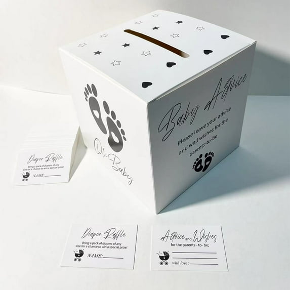 Material: these cards and box are made of cardboard paper which is more stable; The card is and easy to write so that every guest can write the name or encouraging words they want to give to your baby