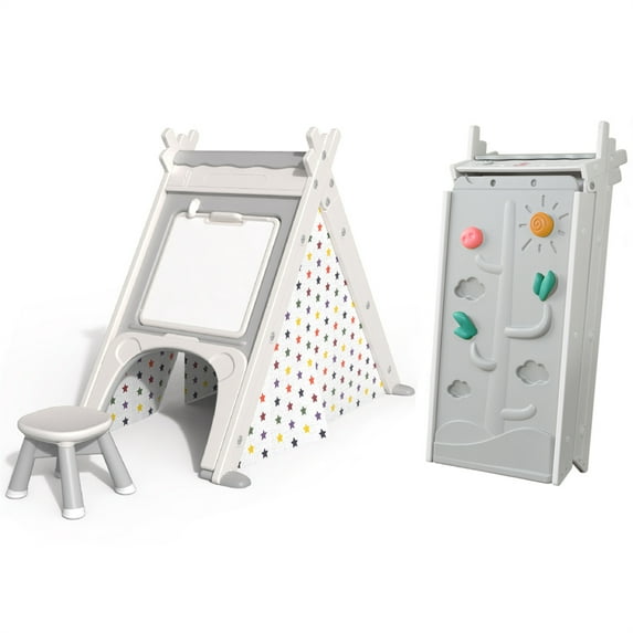 Kids Play Tent, 4 in 1 Teepee Tent with Stool & Climber, Foldable Playhouse Tent for Boys & Girls, HDPE Play House, 59” x 34.3” x 47.5”, Grey