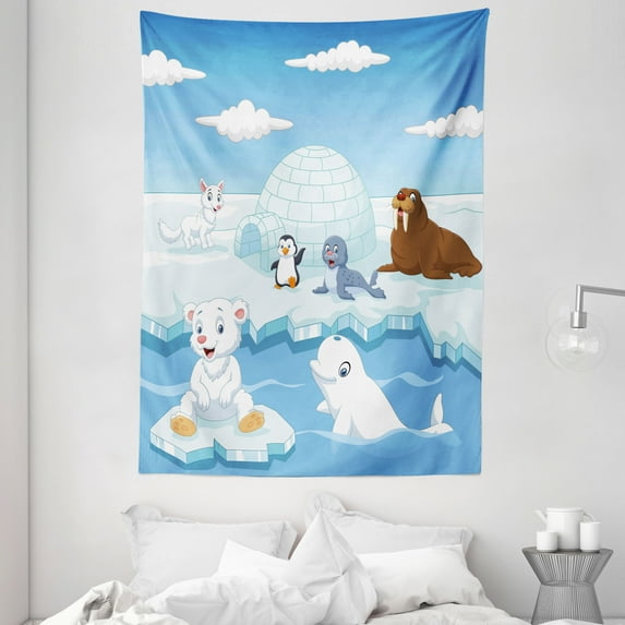 Hero image 0 of Kids Tapestry, Image of Arctics Animals Polar Bears Seal Penguins Wolfs Whales Work of Art, Wall Hanging for Bedroom Living Room Dorm Decor, 60W X 80L Inches, Sky Blue and White, by Ambesonne, 0 of 2