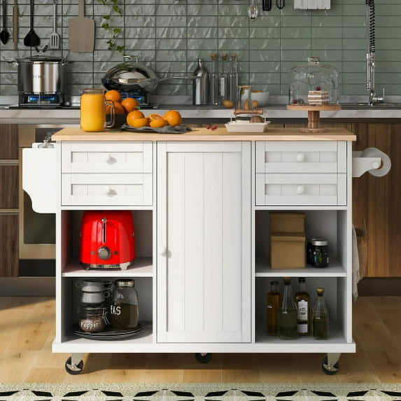 Hero image 0 of Kitchen Island with Rubber Wood Top, Rolling Mobile Kitchen Island with Storage and Towel Rack, Rolling Kitchen Table with Drop Leaf Countertop, Adjustable Shelves Drawers,Island Table Kitchen White, 0 of 7
