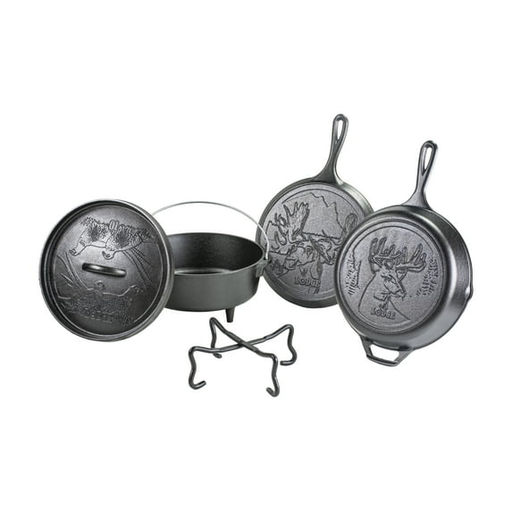 The Lodge Wildlife Series 5 Piece Set of Cast Iron combines the most needed cast iron cookware pieces for a complete kitchen. For beginners and experienced chefs alike, this set makes the perfect gift that will be cherished for decades. Complete with a 10.5 Inch Griddle with Moose Scene, 10.25 Inch Skillet with Deer Scene, 4 Quart (10 Inch) Camp Dutch Oven, 10 Inch Camp Lid with Pheasant Scene, and 4-in-1 Camp Dutch Oven Tool. Each cast iron piece is pre-seasoned for an easy-release finish that improves with use. The cookware provides excellent heat distribution and retention for consistent, even cooking, and features easy-grip handles for great control and hanging storage when not in use. This set offers an abundance of possibilities. Use the pieces to sear, sauté, simmer, bake, broil, braise, roast, fry, and grill. Each piece is safe to use in the oven, on the stove or grill, and over a campfire. Lodge cookware is made for decades of cooking.