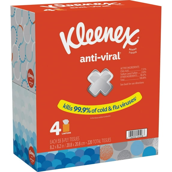 18774.6 out of 5 Stars. 1877 reviewsShipping, arrives in 3+ daysKleenex Anti-Viral Facial Tissues, 4 Cube Boxes, 55 Tissues per Box, 3-Ply $6.58 Was $19.02 $2.99/100 ct