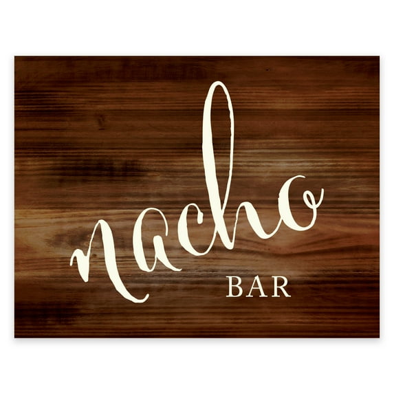 Create a festive and fun atmosphere at your wedding or special event with a Nacho Bar featuring a rustic wood party sign. Measuring 8.5 inches by 11 inches, this single-sided sign features a high-resolution print on heavy cardstock with a matte finish, giving the appearance of elegant wood texture without the added weight. Use this versatile sign to decorate tables, food stations, guestbook and card displays, dessert arrangements, or party favor tables. Whether you choose to place it on a mini table easel, in a photo frame, or on a wall, this custom sign is sure to guide guests and add a unique touch to your special event. Digitally printed with bold vibrant colors, the sign is made with high-quality cardstock paper, ensuring its durability throughout the night. Please note that actual colors may vary slightly from the colors on your screen due to different monitor settings. Frame sold separately, not included.