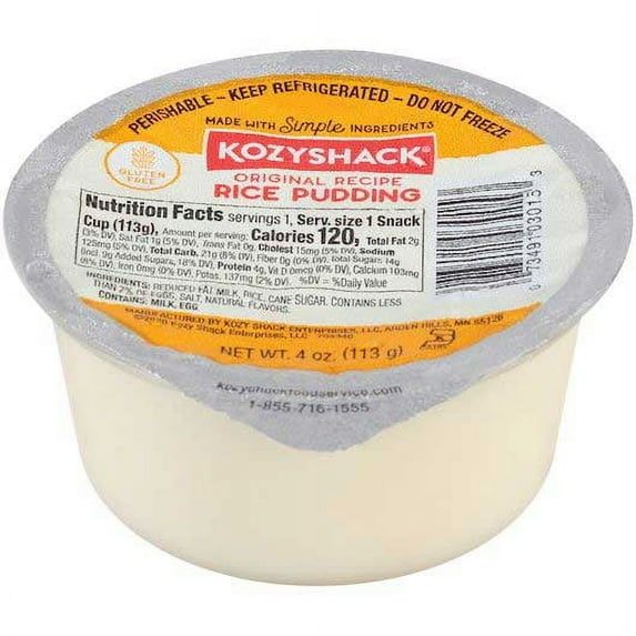 4134.1 out of 5 Stars. 413 reviewsSave withPickup todayDelivery todaySNAP EBT eligibleKozy Shack Rice Pudding, Gluten Free Dessert, 22 oz Tub $3.82 17.4 ¢/oz