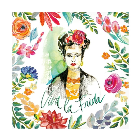 Artist: Kristy RiceSubject: FloralStyle: Modern & ContemporaryProduct Type: Gallery-Wrapped Canvas Art This ready to hang, gallery-wrapped art piece features an illustration of Frida Kahlo with a floral boarder. Prominent Colors: White, Grey, Yellow, Light Blue, Red, Green, Pink Kristys watercolor flowers, bold patterns and expressive landscapes combine a certain textural realism with a distinctive juicy boldness that epitomizes her love affair with watercolor and mixed media painting. Kristys work, like her personality, is at times difficult to pin down. Her brushstrokes can ebb and flow from highly detailed and meticulous to free flowing and boundless, all the while remaining captivating and unmistakable. Giclee (jee-clay) is an advanced printmaking process for creating high quality fine art reproductions. The attainable excellence that Giclee printmaking affords makes the reproduction virtually indistinguishable from the original piece. The result is wide acceptance of Giclee by galleries, museums, and private collectors. Gallery wrap is a method of stretching an artist's canvas so that the canvas wraps around the sides and is secured a hidden, wooden frame. This method of stretching and preparing a canvas allows for a frameless presentation of the finished painting. Whether it's a contemporary, rustic, modern, or traditional style decor, Trademark Fine Art offers a variety of high-quality, carefully built wall art that will surely complement any style. We provide an abundance of art themes that range from fascinating abstracts to breathtaking landscapes. With an assortment of sizes and styles such as Framed, Matted Framed, Panel, Aluminum, Wood Canvas or other mediums, our art will certainly bring excitement to any area of your home. From the bedroom, to the living room, or even the office, Trademark Fine Art makes professionally handcrafted, ready to hang wall decor that will be admired for years to come!IMPORTANT: Avoid buying counterfeit products and transacting with unauthorized sellers. Look for our logo on the packaging for every one of our products. Trademark Fine Art is committed to providing the consumer with the absolute best price and value on our entire line of products, which we ensure by applying a rigorous Quality Control process. Trademark Fine Art is a registered trademark protected by . Trademark law and will be vigorously defended.