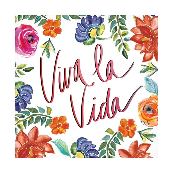 Artist: Kristy RiceSubject: FloralStyle: Modern & ContemporaryProduct Type: Gallery-Wrapped Canvas Art This ready to hang, gallery-wrapped art piece features the words viva la vida with a floral boarder. Prominent Colors: White, Pink, Red, Green, Grey, Blue, Orange Kristys watercolor flowers, bold patterns and expressive landscapes combine a certain textural realism with a distinctive juicy boldness that epitomizes her love affair with watercolor and mixed media painting. Kristys work, like her personality, is at times difficult to pin down. Her brushstrokes can ebb and flow from highly detailed and meticulous to free flowing and boundless, all the while remaining captivating and unmistakable. Giclee (jee-clay) is an advanced printmaking process for creating high quality fine art reproductions. The attainable excellence that Giclee printmaking affords makes the reproduction virtually indistinguishable from the original piece. The result is wide acceptance of Giclee by galleries, museums, and private collectors. Gallery wrap is a method of stretching an artist's canvas so that the canvas wraps around the sides and is secured a hidden, wooden frame. This method of stretching and preparing a canvas allows for a frameless presentation of the finished painting. Whether it's a contemporary, rustic, modern, or traditional style decor, Trademark Fine Art offers a variety of high-quality, carefully built wall art that will surely complement any style. We provide an abundance of art themes that range from fascinating abstracts to breathtaking landscapes. With an assortment of sizes and styles such as Framed, Matted Framed, Panel, Aluminum, Wood Canvas or other mediums, our art will certainly bring excitement to any area of your home. From the bedroom, to the living room, or even the office, Trademark Fine Art makes professionally handcrafted, ready to hang wall decor that will be admired for years to come!IMPORTANT: Avoid buying counterfeit products and transacting with unauthorized sellers. Look for our logo on the packaging for every one of our products. Trademark Fine Art is committed to providing the consumer with the absolute best price and value on our entire line of products, which we ensure by applying a rigorous Quality Control process. Trademark Fine Art is a registered trademark protected by . Trademark law and will be vigorously defended.
